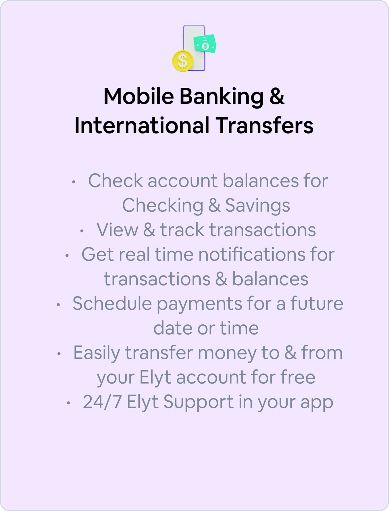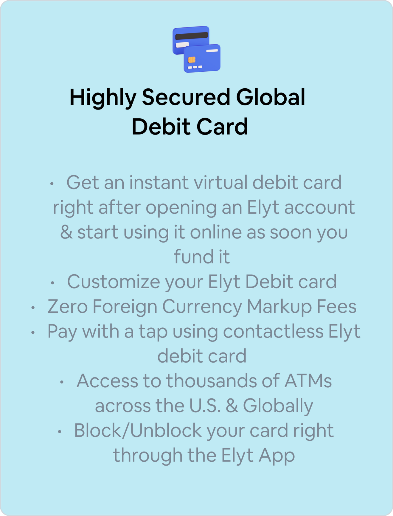 Elyt's is a cross-border Fintech that helps International Students prepare for their financial life in the U.S. by equipping them with right financial tools and educating them on financial literacy, in turn giving them a chance to start their life on an equal footing.Currently Elyt Serves: Indian students who are migrating to United States or have already migrated. We let students apply for a US Bank Account and US Credit Card from India, with minimum documentation and zero application fees.
